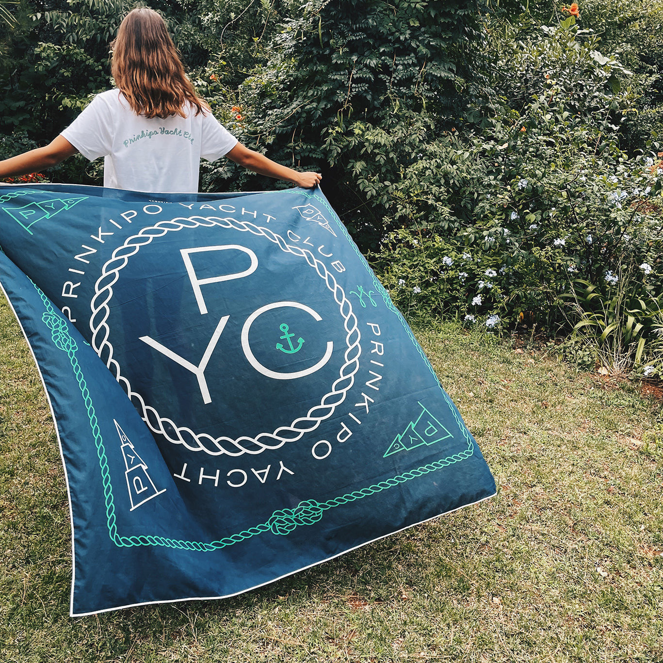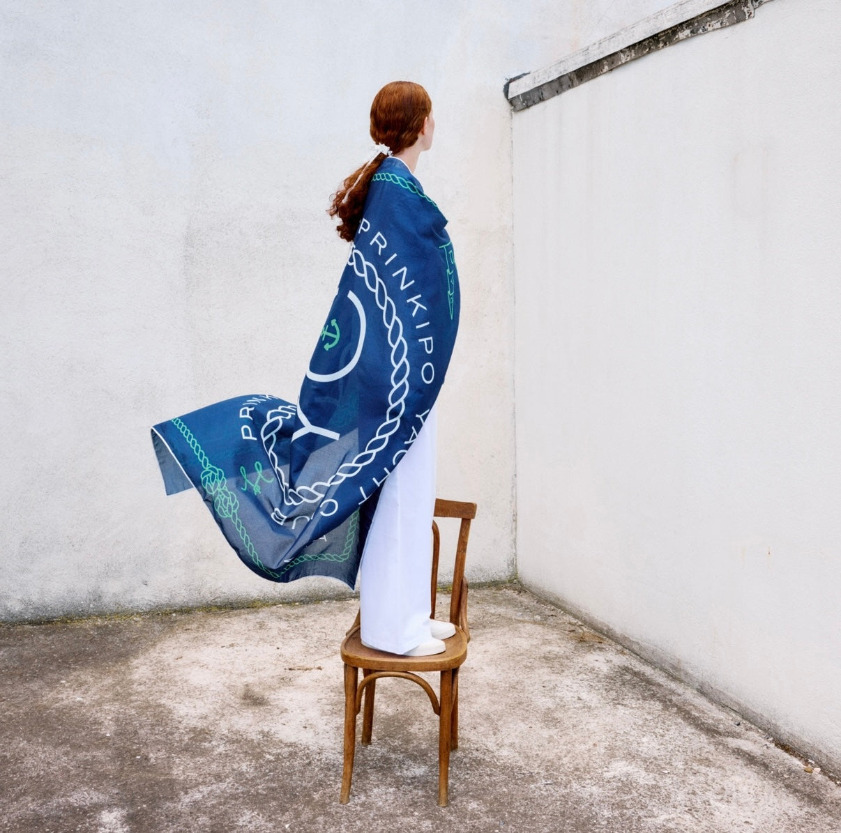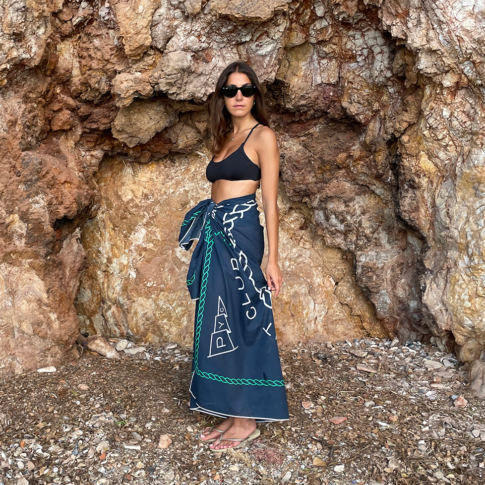THIS LIMITED PAREO IS AN EFFORTLESSLY ELEGANT ADDITION TO YOUR VACATION WARDROBE. IT’S PRINTED WITH PYC LOGO IN NAVY AND GREEN THAT’LL PAIR WITH BEAUTIFULLY WITH OTHER PIECES FROM THE PRINKIPO YACHT CLUB COLLECTION.